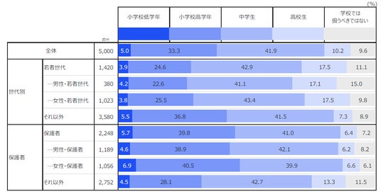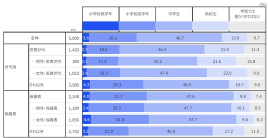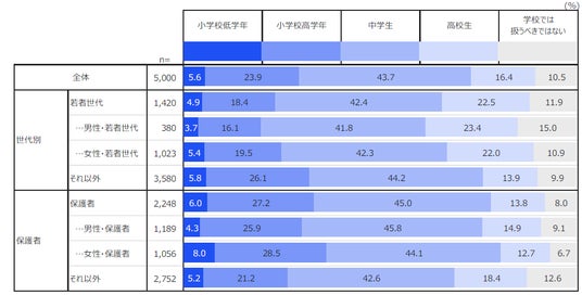 また、インターネット・スマートフォン使用の低年齢化を背景に「インターネットの使い方」については過半数(53.5%)が小学校からの指導を求めており 、特に女性保護者の6割以上が早期のリテラシー教育を望んでいると明らかになりました。
