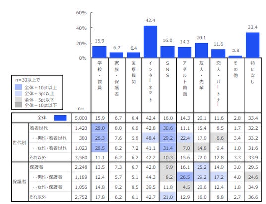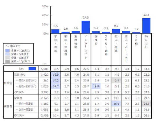 全体では「インターネット」(42.4%)が最多となり、次いで「特になし」(33.4%)、学校・教員(15.9%)と続きました。インターネット上の性情報に関して、「自分が知りたいことを調べるだけだから、本当に大切なことが調べられているか分からない」(21歳・女性)といった、情報の取捨選択や正確性に対する不安の声が寄せられました。