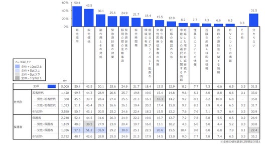 薬局での購入に際して知りたい情報として、「販売場所(50.4%)」や「価格(43.5%)」が多く、薬剤師には「簡潔な説明(39.6%)」を求める声が多くありました。