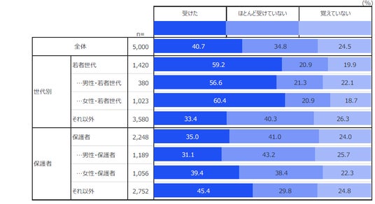 「性教育を受けた」のは約4割。学んだ内容は「体の変化・思春期」が中心だが、保護者の約8割が中学校までに「避妊」、「性的同意・性暴力」など幅広い学習を始めるのが適切と回答。