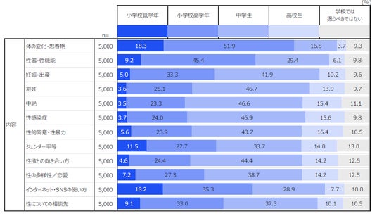 さらに、保護者層では、より早期の性教育を求める傾向があり、約8~9割が「妊娠・出産」、「避妊」、「性的同意・性暴力」を含む幅広い性教育を中学校までに教え始めるのが適切と回答がありました。