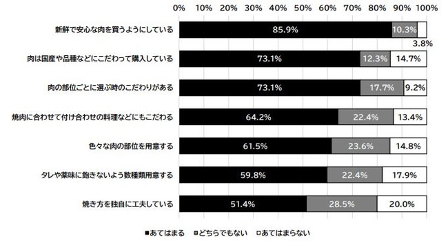 おうち焼肉をする際のこだわりについてお聞きしましたところ、「新鮮で安心なお肉を買うようにしている」が85.9%という結果となっています。また、肉は国産であることや肉の品種、部位ごとの選び方にこだわりをもっている方が7割以上いることがわかりました。