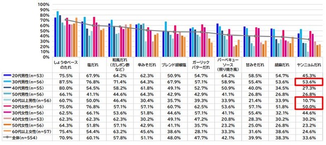 全体では「しょうゆベースのたれ」70.9%、「塩だれ」60.1%、「和風だれ(だしポン酢など)」57.8%の順。