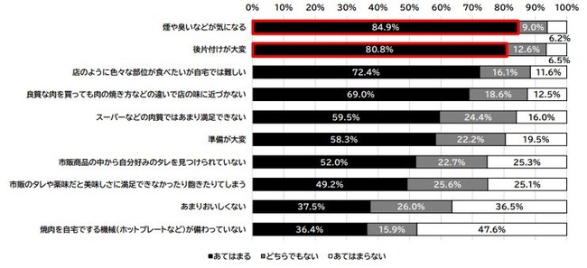 「煙や臭いなどが気になる」は84.9%、「後片付けが大変」が80.8%と8割を超える結果に。