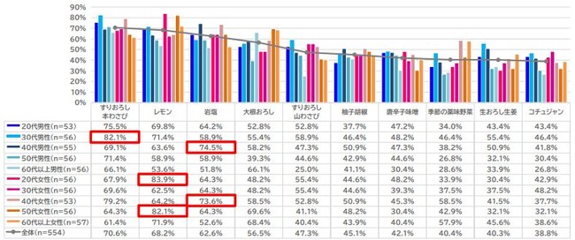 全体では「すりおろし本わさび」70.6%、「レモン」68.2%、「岩塩」62.6%の順。