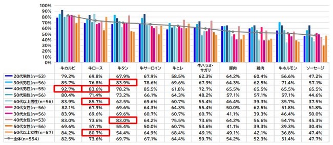 全体では「牛カルビ」82.5%、「牛ロース」73.6%、「牛タン」69.7%の順。