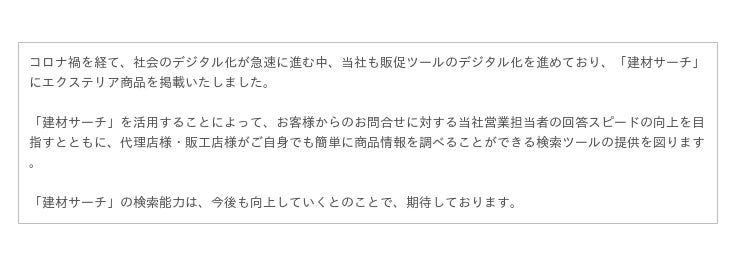 今後は、商品検索だけでなく、見積もり、受発注、支払いなどが一貫して行える建材分野の総合ECプラットフォームを目指してまいります。