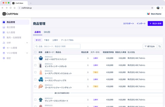 CraftMate(クラフトメイト) は、Shopify・スマレジ・ロジレスと直接連携し、アパレルブランドの基幹業務を一元管理できるクラウド型システムです。(アパレル以外の業態でもご利用いただけます)