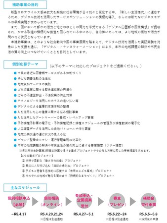 本補助事業は、このような社会動向や国の事業展開を踏まえて、デジタル技術を活用した実証実験を対象にした支援を通じ、「DX」により、本市の地域課題の解決や市民生活の質の向上につなげていくことを目的としています。