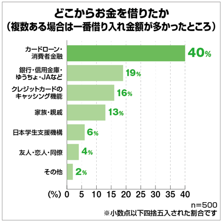 どこでお金を借りたか?という質問には、カードローン消費者金融という回答が4割に。