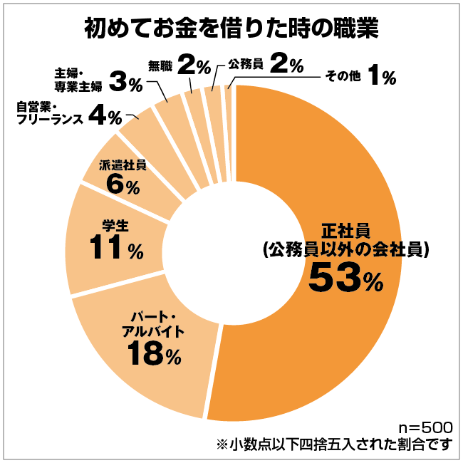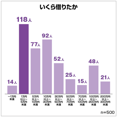 初めてお金を借りたとき、いくら借りたのかという質問では、1万円未満~50万円未満という回答が全体の約7割でした。