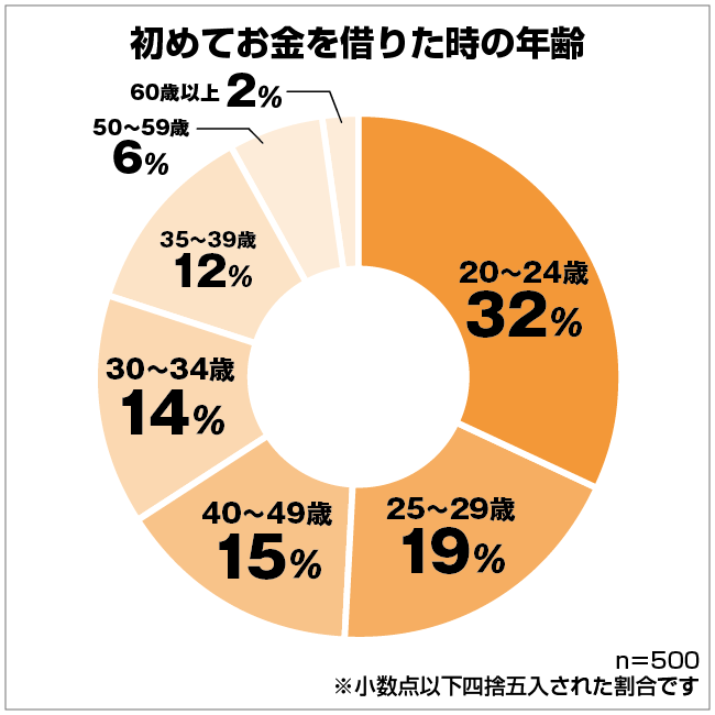 初めてお金を借りた年齢は20~24歳が32%と最も多い結果に。