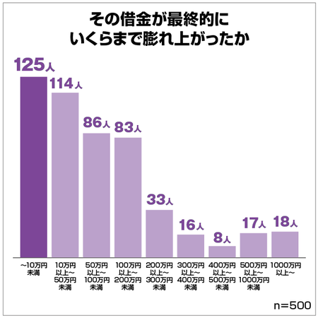 借金がいくらまで膨れ上がったかという質問には、200万円未満という回答が全体の約8割を占めました。最終的には借金の金額が1,000万円以上になったという方も。