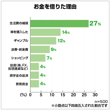 お金を借りた理由は、「生活費の補填」が最も多く27%でした。まとまったお金が急に必要になったからというよりも、普段からお金が足りておらず借入するという人が多いのかもしれません。