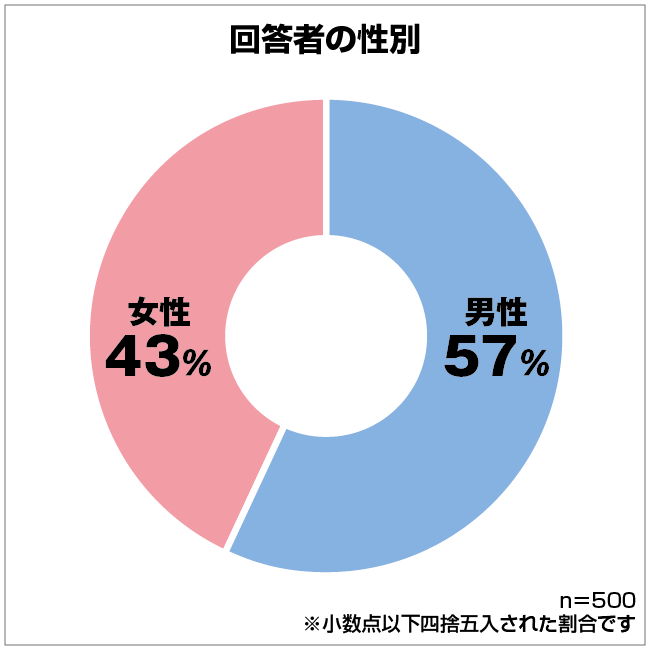 男性:57%、女性:43%と、男女比は少しだけ男性からの回答が多い結果となりました。