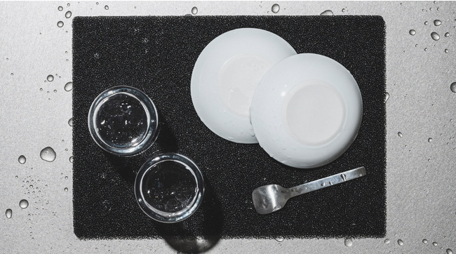 水切れの良いウレタンを使って、食器の水切りマットをつくりました。ちょっとだけ食器を使ったときにさっと取り出して乾かせます。ウレタンの柔らかさが、ガラスや金属の食器をやさしく受け止めます。ダイニチがこれまでに培ったスポンジのノウハウを活かした、水切れの良いスポンジ素材を用いた水切りマットです。