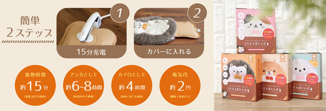 弊社の人気商品である「コロまるシリーズ」からお湯は一切いらない、コードレスで持ち運びにも便利な“蓄熱式湯たんぽ”の登場です。1回の蓄熱時間が約15分で、最長約8時間暖かさが持続する蓄熱式の湯たんぽです。(※用途によって持続時間は変動します。) 蓄熱1回あたり約2円で、電力需給ひっ迫の懸念がある2022年度冬季には節電対策にもなり、家計にも優しく防寒対策ができます。