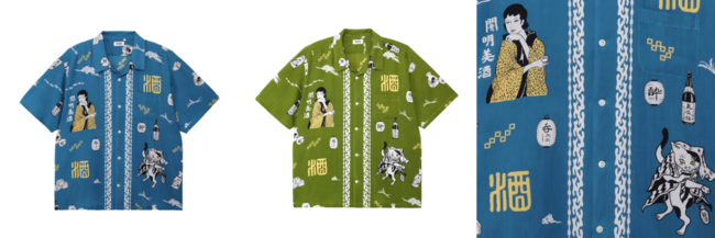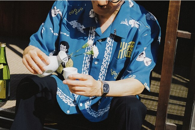 「日本酒」をテーマに、レトロポップなアイコンを散りばめた総柄&ボーダーパターンのアロハシャツ。カラーは徳利をイメージしたブルー、酒瓶をイメージしたグリーンの2色展開。このシャツで粋な大将や気の合う仲間と共に旨い肴と地酒を楽しめば、いいあんべぇになれること間違いなし。