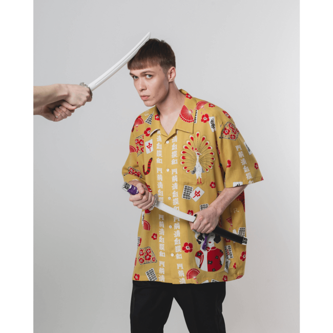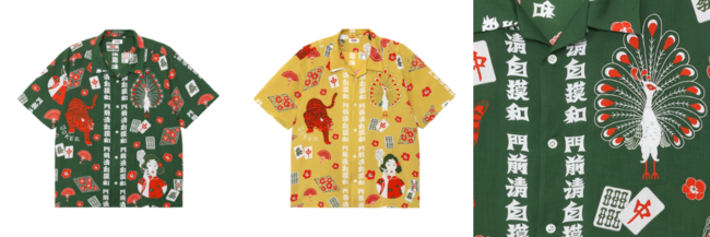 「麻雀」をテーマに、様々なアイコンを散りばめた総柄&ボーダーパターンのアロハシャツ。昨年即完売した人気作が、パターンの変更と新色追加で再登場。麻雀の本場である中国を彷彿とさせるグリーンと、牌の背面をイメージしたマスタードの2色展開。ボタン横に描かれた「門前清自摸和」は、自力でツモっていく人生を送ろうというメッセージ。