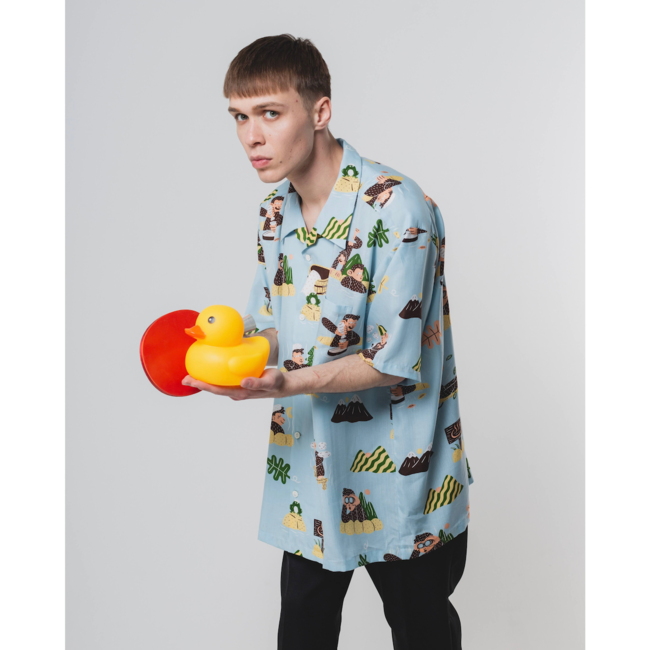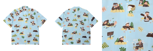 「温泉」をテーマに、本能のまま風呂を楽しむ人を「擬猿化」した総柄のアロハシャツ。ポップで渋いカラーリングのアイコンが水色のボディに映えるデザインは、湯上がり後にサラッと羽織って外に出れば、外気の心地良さをより感じられる。温泉・銭湯・サウナの相棒にぴったりな1着。