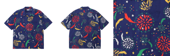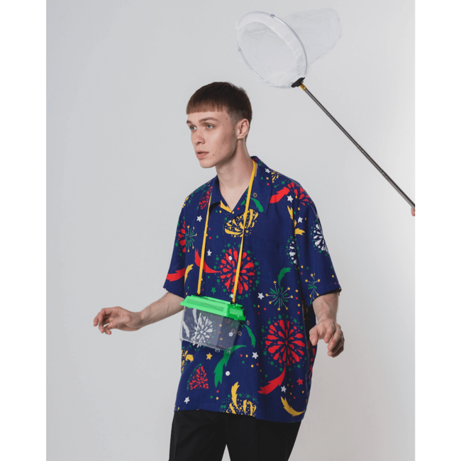 「花火」をテーマに、夏の夜空に浮かぶスイカ模様の打ち上げ花火をプリントした総柄のアロハシャツ。「大きいことでも些細なことでも、自分で花火を打ち上げる。」そんな程よい野心と決意が込められたこの1着は、この夏をとことん楽しみたい人にオススメ。