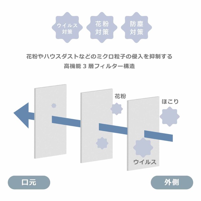 3層構造で、花粉やPM2.5はもちろん、粒子の小さいウイルス飛まつにも対応します。