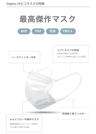 「毎日を豊かに。暮らすことに役立つ未来に。」をコンセプトにパッケージのスタイリッシュさとマスク本体の機能性を両立させたマスクブランド『cepico(セピコ)』シリーズはマスクだけにとどまらず様々な衛生用品を販売いたします。