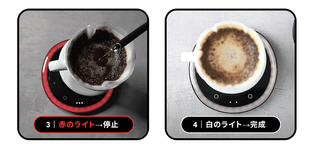 ハンドドリップは注ぐお湯のコントロールがとても重要です。POURX OURAは、注水速度をリアルタイムに検知し、ドリップのリズムが設定された条件を下回ると、すぐにランプの点滅で速度調節を促し、理想に近いコーヒーのドリップを可能にします。