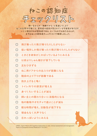 愛猫が認知症かどうかを知る方法の1つとして、ねこの認知症チェックリストがあります。認知症でよく見られる行動がリストになっており、当てはまる行動がいくつかあると認知症の可能性があります。会場では、その他にも認知症に関する掲示物をご用意しており、ねこちゃんとの末永い暮らしのために飼い主さんができることを学べる場となっております。
