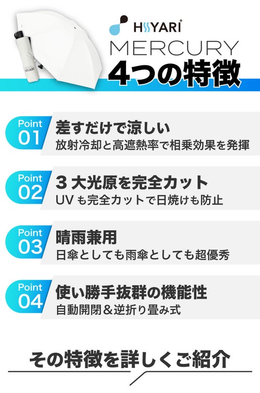 株式会社YF TRADE(本社:東京都中央区、代表取締役:福田 康弘、以下「YF TRADE」)は、地球の気候変動により年々平均気温が上昇する中、外出を少しでも快適に過ごせるよう、熱中症・暑さ対策の切り札として、「放射冷却」×「100%完全遮光生地」の晴雨兼用傘「HIYARI MERCURY(以下、HIYARI マーキュリー)」を商品開発いたしました。