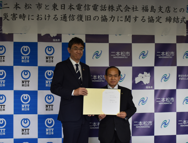 二本松市(市長:三保 恵一)と東日本電信電話株式会社 福島支店(支店長:畠山 良平、以下「NTT東日本」)は、災害時の相互協力による通信中断の早期復旧に向けた「災害時における通信復旧の協力に関する協定書」を締結しました。
