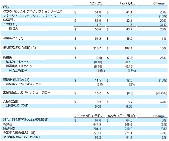 調整後収益 (1) は、FY23 Q1 に 5,420 万ドルで、FY22 Q1 から 11%増加した