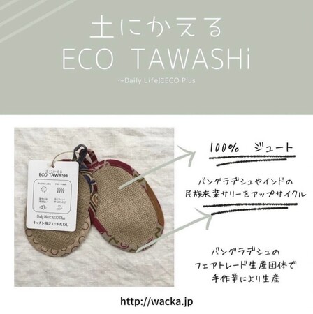 CORR-The Jute Worksは、WFTO世界フェアトレード連盟認証のフェアトレード生産団体です。バングラデシュの特産品であるジュートを中心に手工芸品を製作しています。農村部の女性たちの生活向上を目的に設立され、現在では全土に5000人以上の生産者とともに活動しています。 材料には二酸化炭素の吸収量が高く、温室効果ガス抑制に効果があるジュートを使用。使用中はマイクロプラスチックの発生を抑え、使用後は、土に還る素材であることも特徴的。縁取りにはインドやバングラデシュの民族衣装であるサリーをアップサイクルし、WAcKAらしさを演出、ポップな色合いが、洗い物を楽しませてくれます。