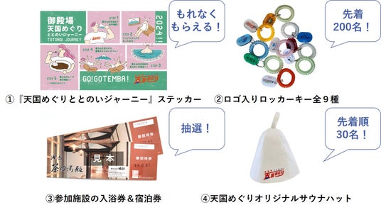 スタンプ数に応じて、『天国めぐりととのいジャーニー』のオリジナルステッカー、ロゴ入りロッカーキーやサウナハットなどの天国めぐりオリジナルグッズが当たります。