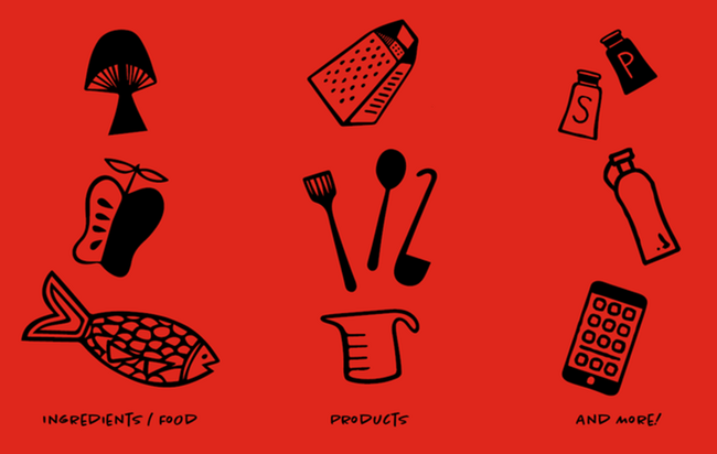 手書き風の魚や果物、フォークやグラインダーなどをあしらったパターンがありました。