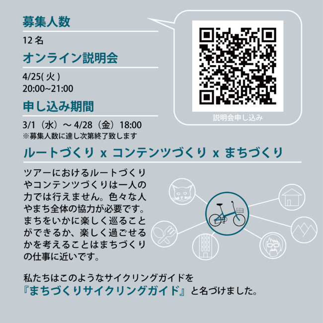 「サイクリングガイドを始めたいが、何から始めて良いのかわからない。」「活動をし始めたが、中々成果がでない。」「まちづくりの一環としてサイクリング事業を担当しているが、知識もスキルもない。」