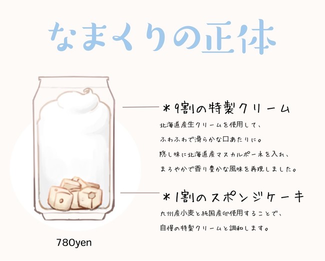 365日生クリームを食している生クリーム愛好家の代表の井上(以下、そそう丸)が100回以上の試行錯誤を繰り返して作り上げた『なまくり』には、北海道の豊かな大地でのびのびと育った乳牛のフレッシュな生乳の生クリームをたっぷりと使用。程よい酸味とコクがアクセントになるマルカルポーネクリームを独自にブレンドした特製クリームがなんと90%も!缶の中がほぼクリームでできている奇想天外なスイーツ、それが『なまくり』の根幹です。
