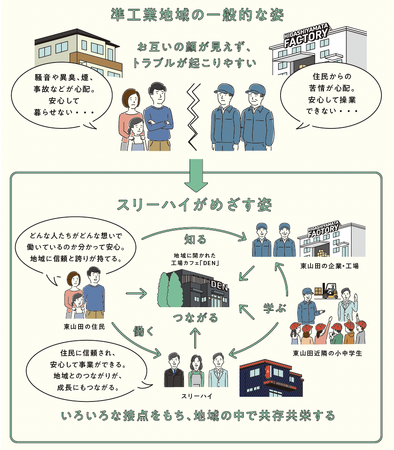 この結果スリーハイは「住宅街にある町工場」に。そこでは地域との信頼関係がなければ事業を続けていくことは困難です。だからこそ、私たちはこれまで「地域とともに生きる」ということに真剣に向き合い、取り組んできました。