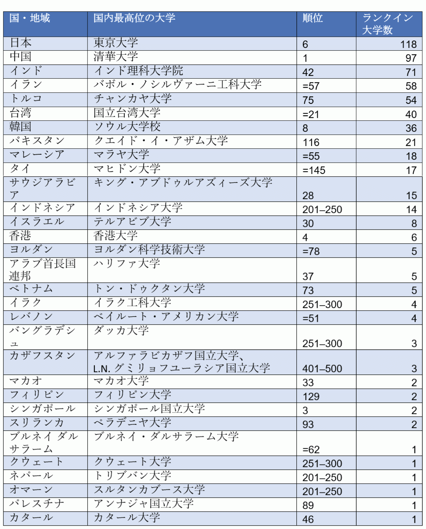 ・中国の大学が3年連続で上位2校の座を維持しています。
