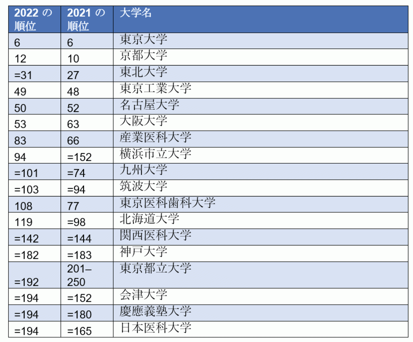 Asian University Rankings 2022 https://www.timeshighereducation.com/world-university-rankings/2022/regional-ranking Click here for the evaluation method of the Asian University Rankings 2022 https://www.timeshighereducation.com / world-university-rankings / asia-university-rankings-2022-methodology