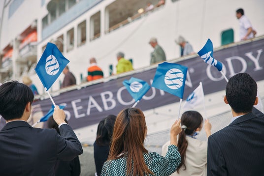 MITSUI OCEAN CRUISESの関係者が 横浜港にSeabourn Odysseyのお客様を歓迎する様子