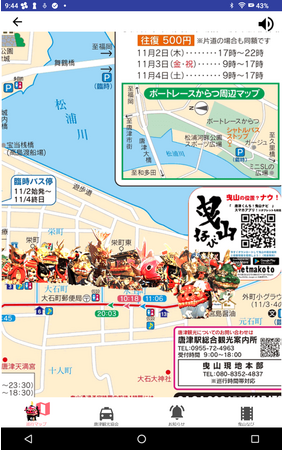 「曳山なび」は、このほかにもスマートホン向けのアプリも無料公開しており、臨場感のある文字通りナビゲーションを唐津くんち当日は行っています
