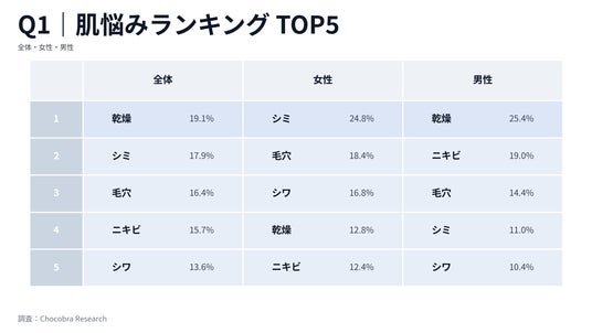 - 全体1位は「乾燥」19.1%。女性は「シミ・そばかす」24.8%、男性は「乾燥」25.4%が最多