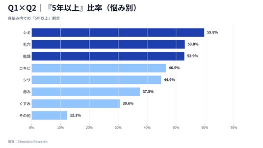 - “5年以上続く悩み”が全体の47.7%。シミは59.8%が「5年以上」