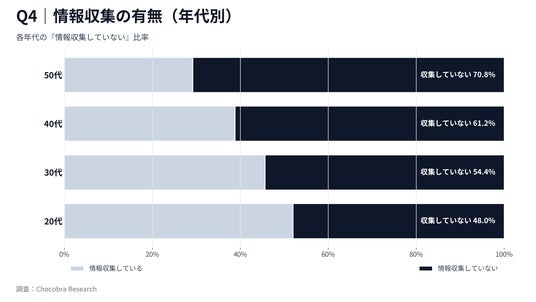 年代別では、50代で70.8%と高く、年齢が上がるにつれて情報収集を行っていない割合が増える傾向が見られます。