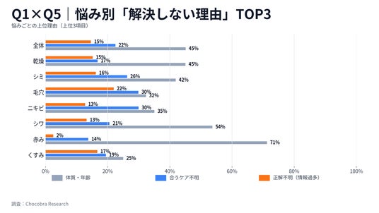 肌悩みが解決しない理由として最も多かったのは、「体質・年齢の問題だと思っている」(45.1%)でした。