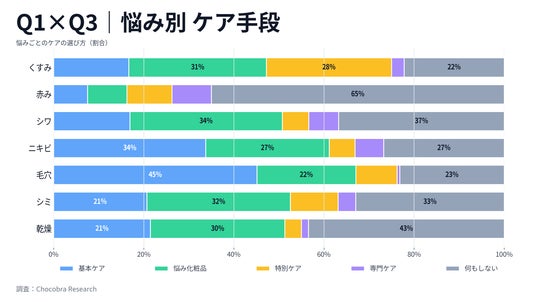 また悩み別に見ると、毛穴悩みでは「基本ケアのみ」が45.1%と最も高く、専用ケアにたどり着きにくい実態がうかがえます。
