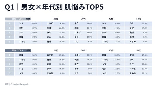 Chocobra Researchは、20代~50代の一般男女1,000人を対象に、「現在もっとも悩んでいる肌悩み」と、その悩みが長く続く背景(継続期間/ケア実態/情報収集/解決しない理由)を調べるインターネット調査を実施しました。 2026年1月調査の結果では、全体では「乾燥」(19.1%)が最も多く、女性では「シミ・そばかす」(24.8%)、男性では「乾燥」(25.4%)が最多となりました。さらに、肌悩みの継続期間をみると、全体の47.7%が「5年以上続いている」と回答。特に「シミ」「毛穴」「乾燥」は長期化しやすい傾向が確認されました。