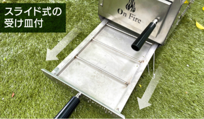 灰の撤去が簡単な受け皿と取っ手付き。