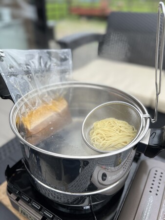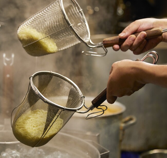 沸かしたお湯の中にまずスープを入れ、スープが温まってきた頃合いを見て、テボのような小さなザル(100円ショップにも売っています)の中に麺を入れて茹でていただくことで1つのお鍋で調理が完了します。ぜひお試しください。